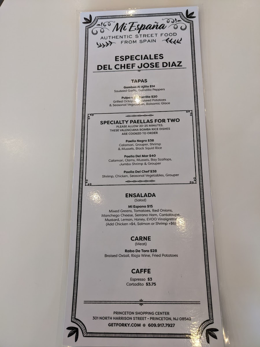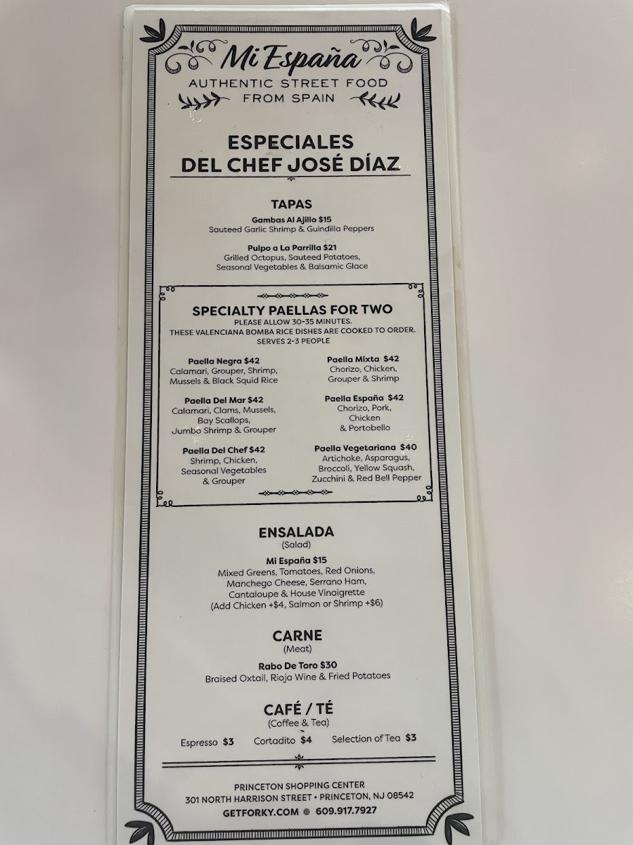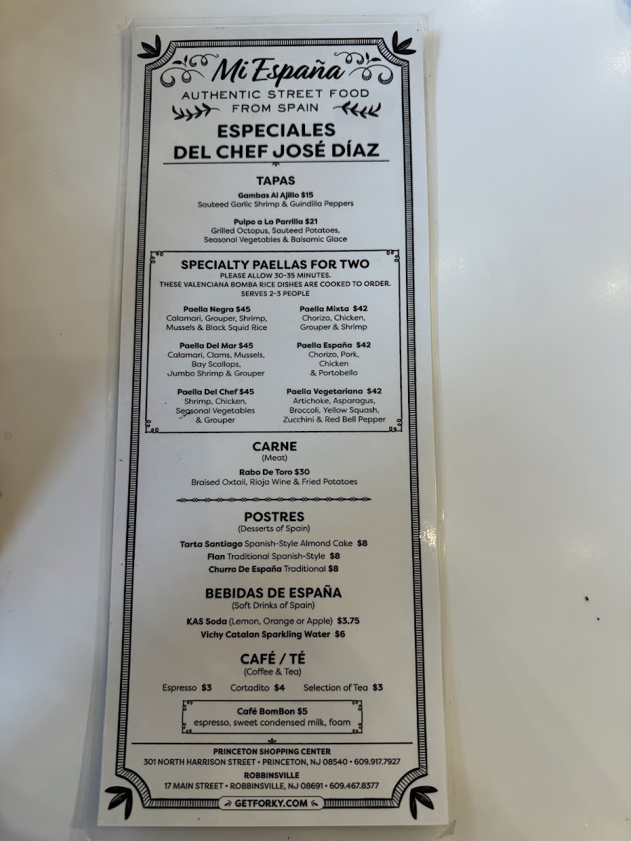 Welcome to Mi España, a delightful culinary gem nestled in Princeton, NJ. This charming restaurant excels in authentic Spanish cuisine, with a menu that prominently features the beloved paella. From the hearty Paella Mixta with chorizo, chicken, and shrimp to the vibrant Paella Vegeterania showcasing artichokes and zucchini, there's something for every palate. The two-person paella options invite sharing, creating a communal dining experience.